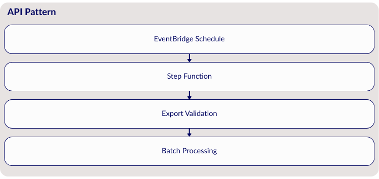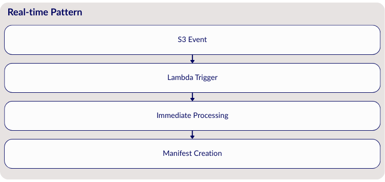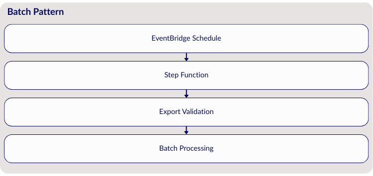 Scheduled Batch Processing addresses the needs of sources that provide periodic data exports. Some integrations use EventBridge cron triggers to initiate Step Functions workflows that coordinate multi-stage processing. These workflows validate export completeness before generating manifests, ensuring data quality and preventing incomplete datasets from entering the lake. The approach provides reliable processing of large datasets while maintaining predictable resource utilisation.