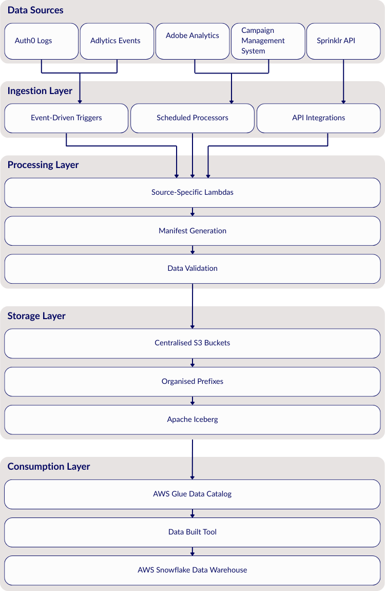 Event-Driven Triggers provide the orchestration mechanism that determines how and when data processing occurs. S3 notifications trigger immediate processing for sources like Adobe Analytics events, while EventBridge schedules coordinate batch processing for sources like dynamoDB exports that provide periodic data dumps. This hybrid approach optimises for both latency and reliability based on each source's characteristics.