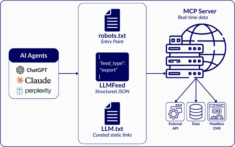 Unlike static sources such as LLMs.txt or LLMFeeds, which provide discoverable and structured information, MCP enables real-time, governed access to live enterprise systems.